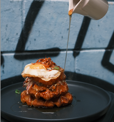 Crunchy chilli honey chicken, Japanese coleslaw, fried egg, topped with crispy sweet potato and maple syrup.