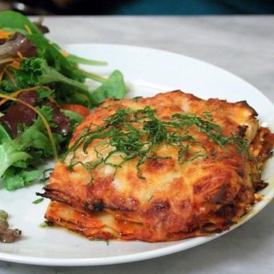 Traditional beef lasagne, napoli sauce, shaved parmesan, served with a side salad with a balsamic glaze