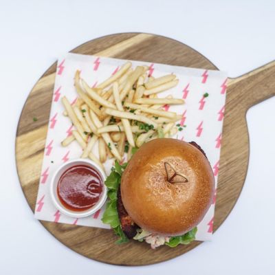 Angus beef patty, american cheddar, caramelised onions, cos lettuce, roma tomatoes, bbq sauce