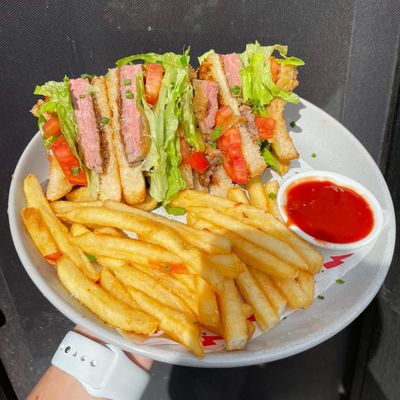 Rib fillet, cheddar cheese, tomato, caramelised onion, lettuce & smokey bbq sauce