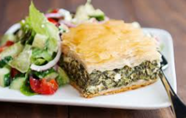 Housemade spinach and feta pie, served with a greek salad and tzatziki