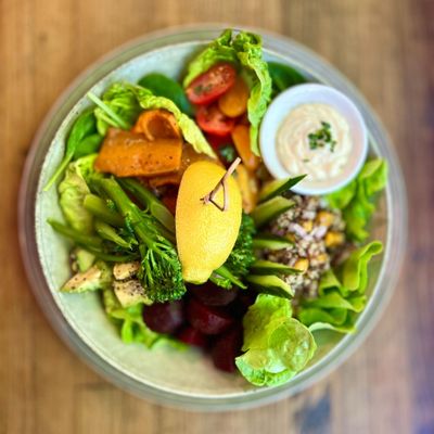 Turmeric spiced chickpeas, beetroot, hummus, avocado, broccolini, salad greens, sweet potato hash, heirloom tomatoes, cucumber, quinoa, vegan aioli